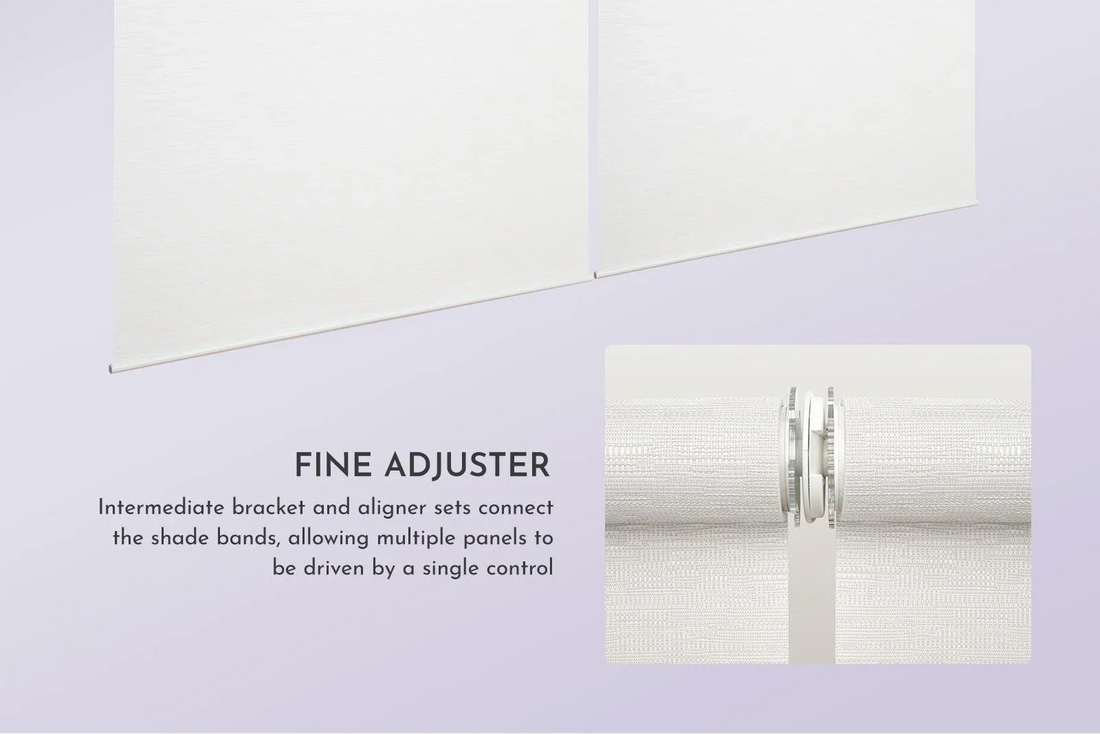 The fine adjuster system uses intermediate brackets and aligner sets to connect multiple shade bands, allowing several panels to be driven by a single control while staying evenly aligned and synchronized.